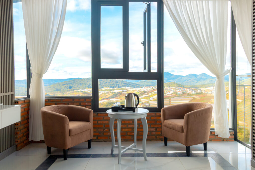 Buổi sáng, ánh sáng trong veo và mây lững lờ trôi qua triền đồi tạo nên cảm giác rất “điện ảnh”. Buổi chiều, nắng dịu và gió mát khiến không gian trở nên êm hơn, phù hợp để đọc vài trang sách, trò chuyện nhẹ nhàng hoặc đơn giản là ngồi im ngắm cảnh. Đây là góc hẹn cho những ai thích sự tĩnh tại, muốn tận hưởng Đà Lạt theo cách nhẹ nhàng và tinh tế.Vào những buổi sớm, mây có thể tràn về phủ nhẹ lên triền đồi, tạo nên cảm giác như đang ở giữa biển mây. Thiết kế tinh tế, tối giản vừa đủ để tôn lên vẻ đẹp thiên nhiên, nhưng vẫn đảm bảo tiện nghi của một kỳ nghỉ dưỡng trọn vẹn. Dù bạn đi cùng gia đình, người thương hay một mình để tìm sự yên tĩnh, không gian này luôn mang lại cảm giác riêng tư, thư thái và được chăm sóc đúng chuẩn resort.