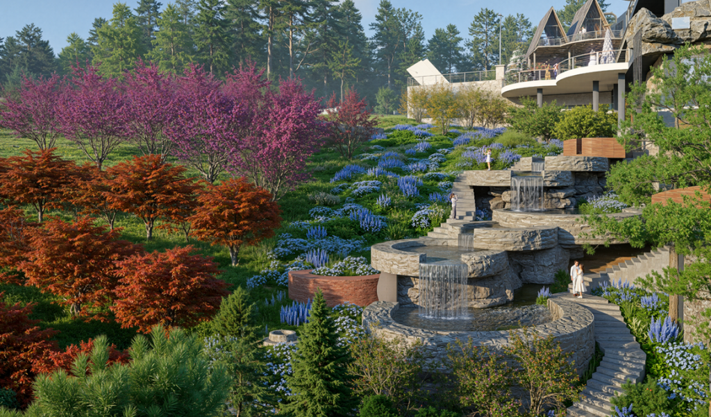 Dòng suối nhỏ len lỏi giữa vườn đào cổ tạo nên một không gian thiền định tự nhiên tại Sun Heaven Đà Lạt, nơi bạn dễ dàng tìm lại cảm giác bình yên từ những âm thanh giản dị.
