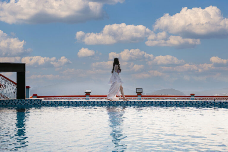 Hồ bơi vô cực ở Sun Heaven được thiết kế để bạn nhìn thẳng ra thiên nhiên mà không thấy ranh giới. Mặt nước như nối liền với thung lũng: bạn ngước lên thấy trời, nhìn xuống thấy nước, nhìn ngang thấy mây. Có lúc mây trôi sát đến mức bạn có cảm giác mình đang bơi “giữa” mây chứ không phải bơi trong hồ.
